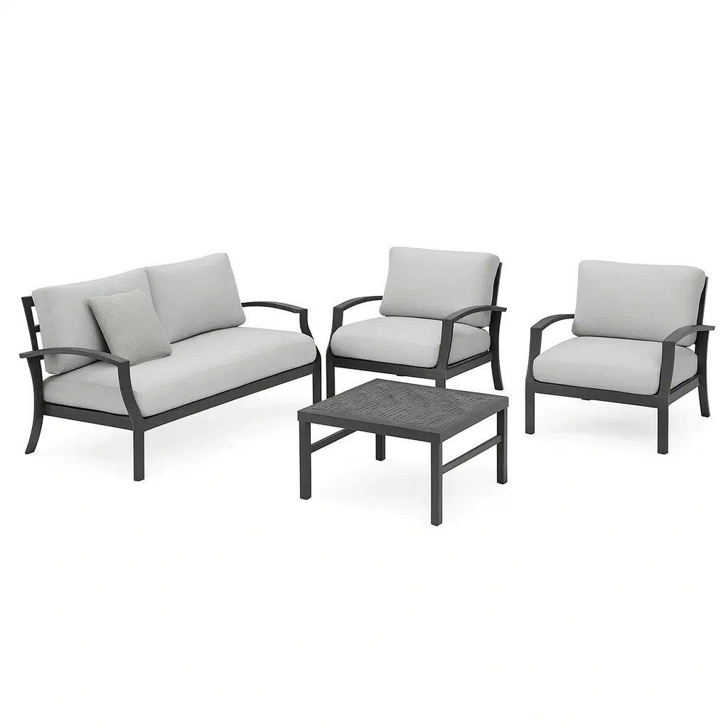 Set di mobili da giardino composto da un divano a 2 posti, due poltrone singole e un tavolino. La struttura è in alluminio resistente e i cuscini sono rivestiti in poliestere. Il colore della struttura è nero e i cuscini sono grigio chiaro.